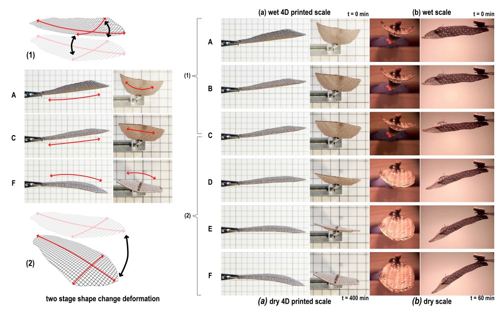 Translating a hygroscopic bilayer principles for stress induced bending from the pine cone scale to a 4D Printed actuator capable of double curvature and multi-phase motion. The research was based on the Bhutan pine (Pinus wallichiana) cone seed scales as the biological role model.