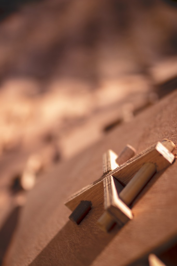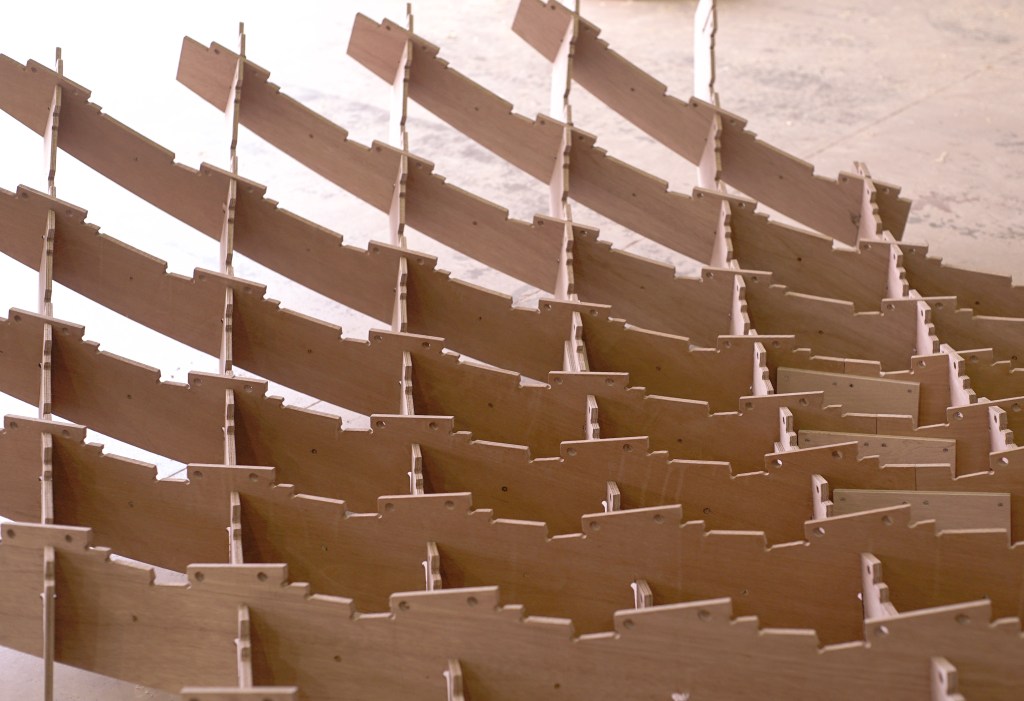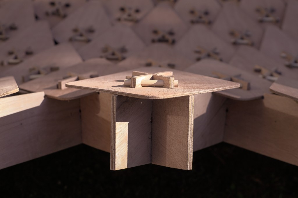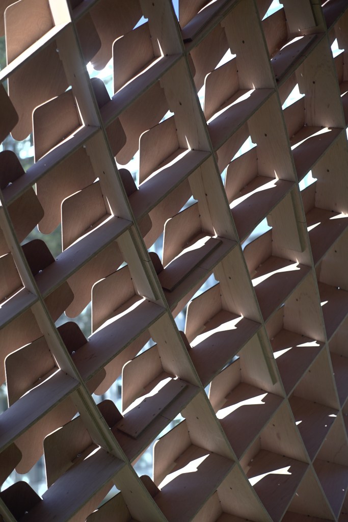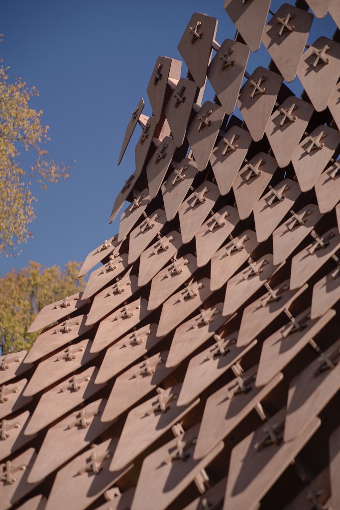 This experimental structure is assembled without any metal fasteners, drawing inspiration from Japanese and Chinese building traditions. The pavilion is composed of an elastically bent gridshell structure that is connected and held in place by structural shingles. These shingles, held in place by wooden dowels, act as strong moment connections by restricting the potential rotational movement of the passing gridshell members. The shingles also provide cover from the rain.