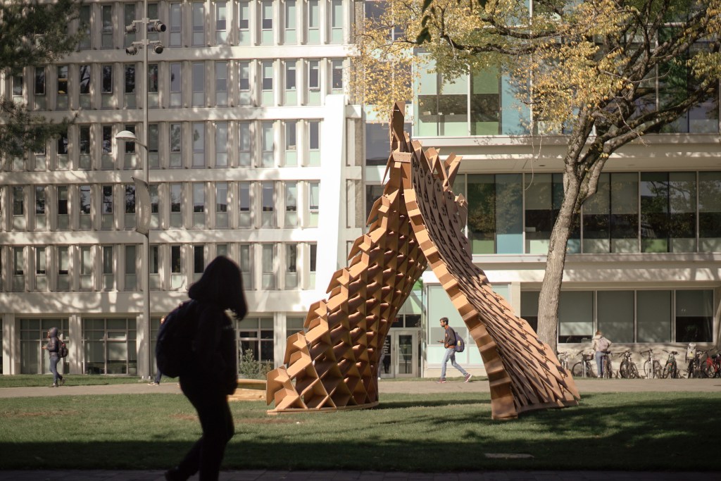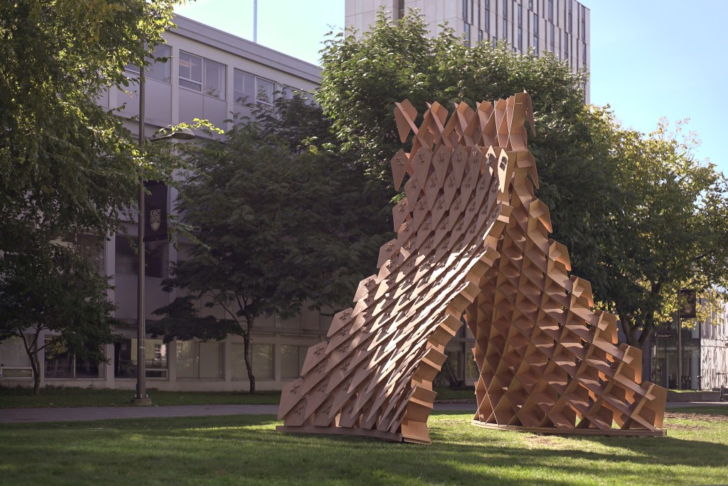The Dragon Skin Pavilion is a robotically-fabricated temporary pavilion, installed at the University of British Columbia. The pavilion is the result of a workshop hosted by the School of Architecture and Landscape Architecture (SALA) and the Centre for Advanced Wood Processing (CAWP), which took place from October 5-9, 2019. The workshop was led by Assistant Professor David Correa of the University of Waterloo, Oliver David Krieg of Intelligent City, and SALA Associate Professor AnnaLisa Meyboom.