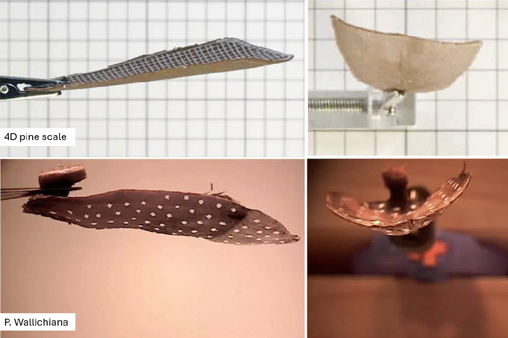 Translating a hygroscopic bilayer principles for stress induced bending from the pine cone scale to a 4D Printed actuator capable of multi-phase motion. The research was based on the Bhutan pine (Pinus wallichiana) cone seed scales as the biological role model.