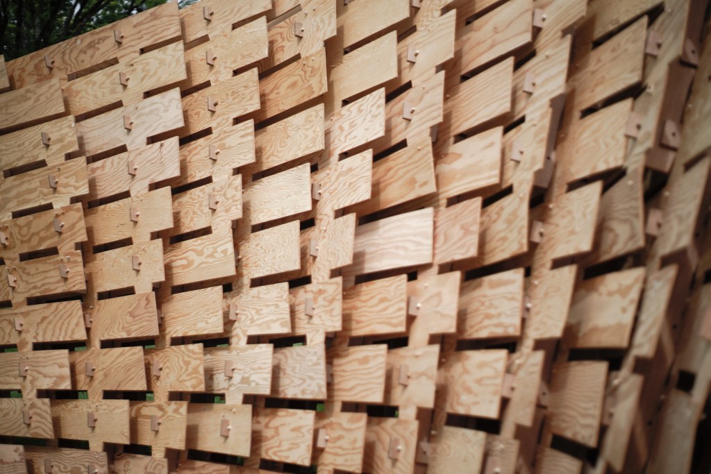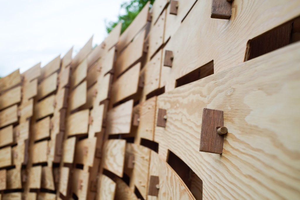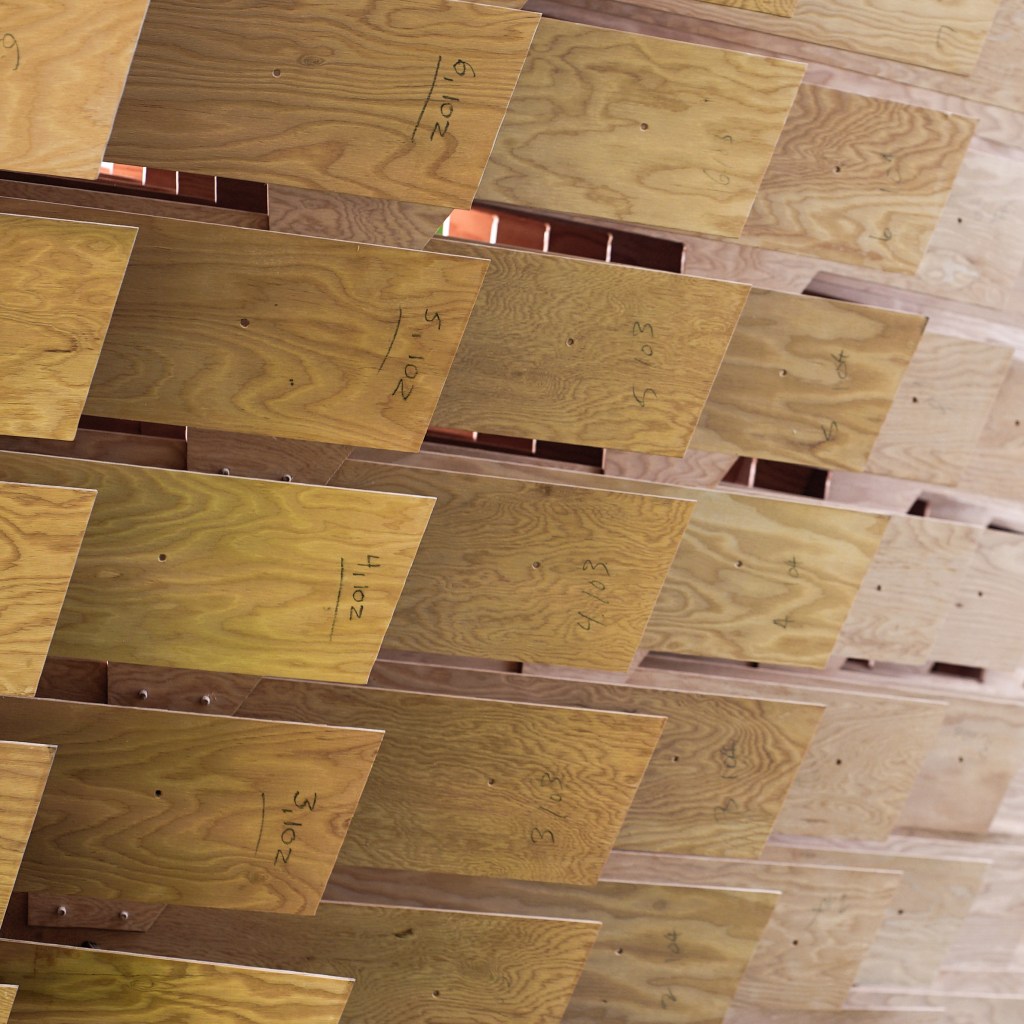 The free-standing structure is a multi-layered plywood assembly that relies solely on precise wood-to-wood joinery; 150 unique wood planks are connected by 43 webs – no screws or nails were used. Rather than using straight, pre-cut sections, the pavilion investigates the limits of elastically bent plywood to create a free-form and light-weight, self-supporting structure. The design pushes each component to bend to its limit, when the curvature asks for a tighter radius than the wood can accomplish, a pattern of lamination begins. The resulting design celebrates the formal potential of the curved plywood while building sectional depth through the mille-feuille like assembly of multiple layers.