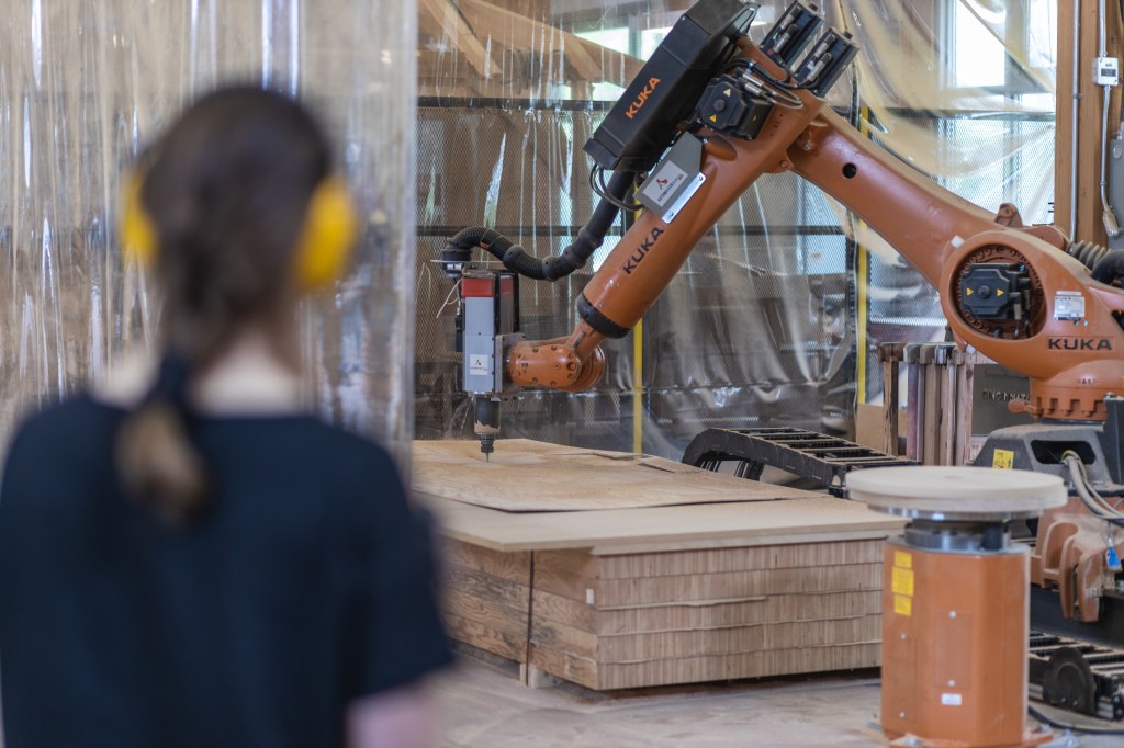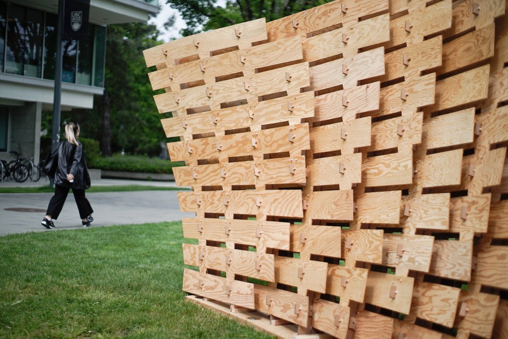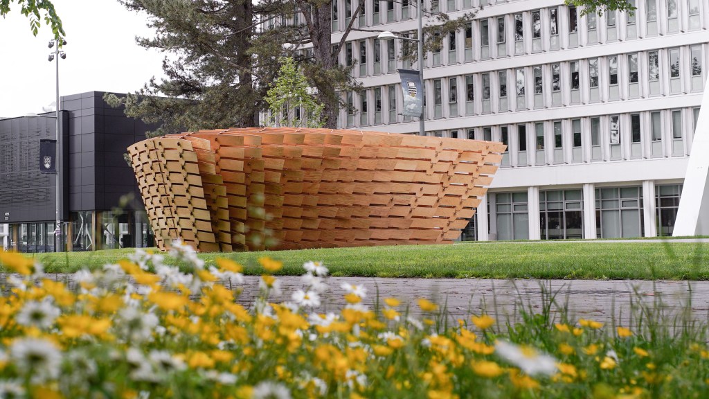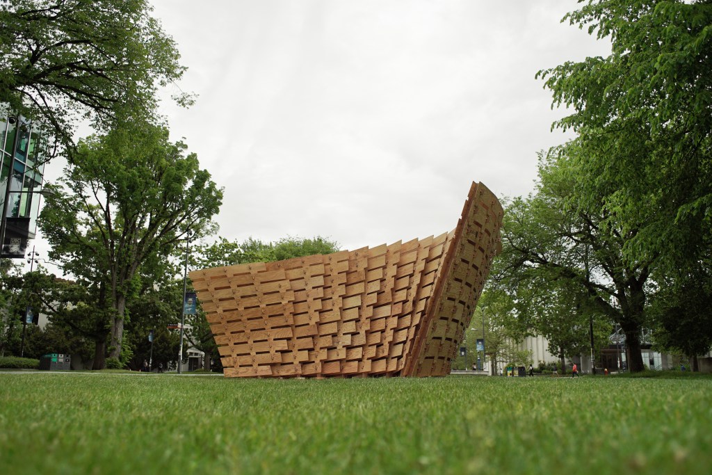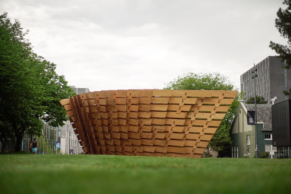 The Mille-feuille Pavilion is a robotically fabricated plywood pavilion that was built as part of a workshop hosted by the School of Architecture and Landscape Architecture (SALA) and the Centre for Advanced Wood Processing (CAWP), which took place from June 4-8, 2022. The workshop was led by Associate Professor David Correa of the University of Waterloo, Oliver David Krieg of Intelligent City, and Associate Professor AnnaLisa Meyboom from UBC SALA.